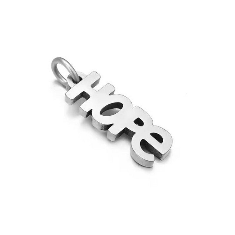 Krásný přívěsek ve tvaru nápisu HOPE = naděje je vyroben z nerezové oceli v úpravě antique silver.