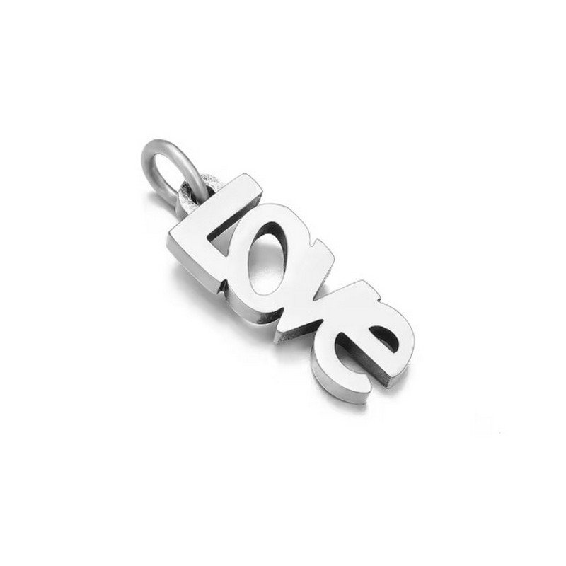Krásný přívěsek ve tvaru nápisu LOVE = láska je vyroben z nerezové oceli v úpravě antique silver.