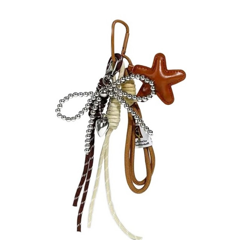 Krásná klíčenka/přívěsek na kabelku v hnědo-béžovém provedení (fotografie 1 a 2) je vyrobena z kůže textilu a kovu.