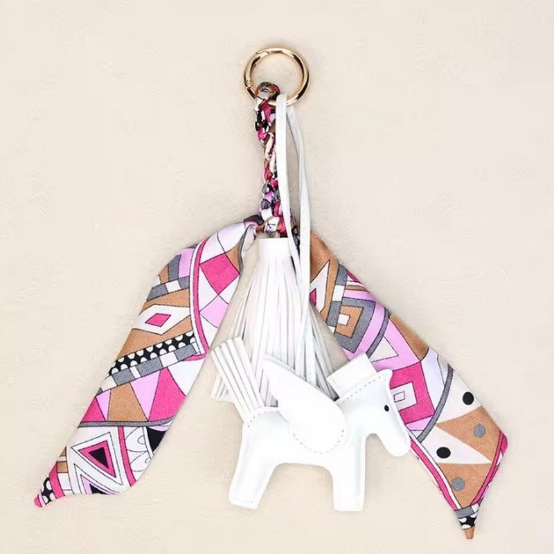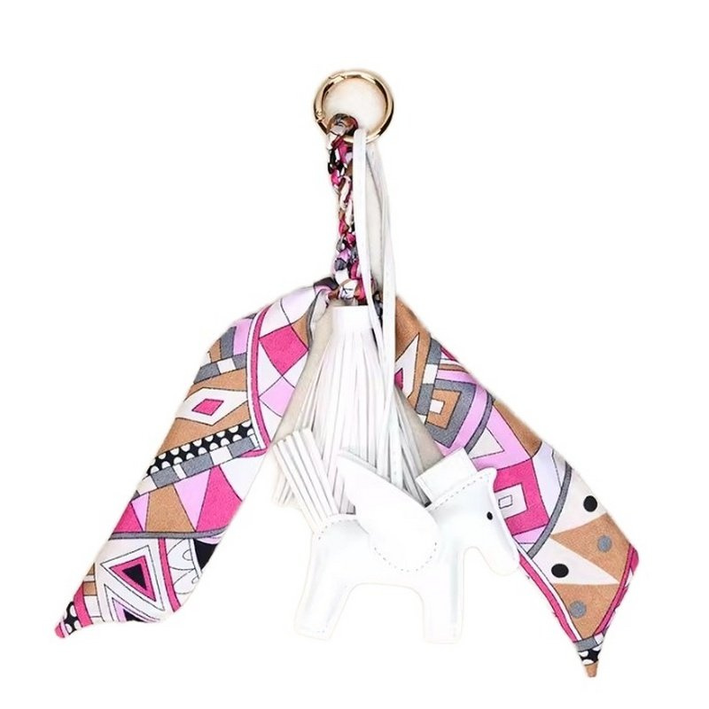 Krásná klíčenka/přívěsek na kabelku s koníkem v bílo-růžových odstínech je vyrobena z kůže textilu a kovu.