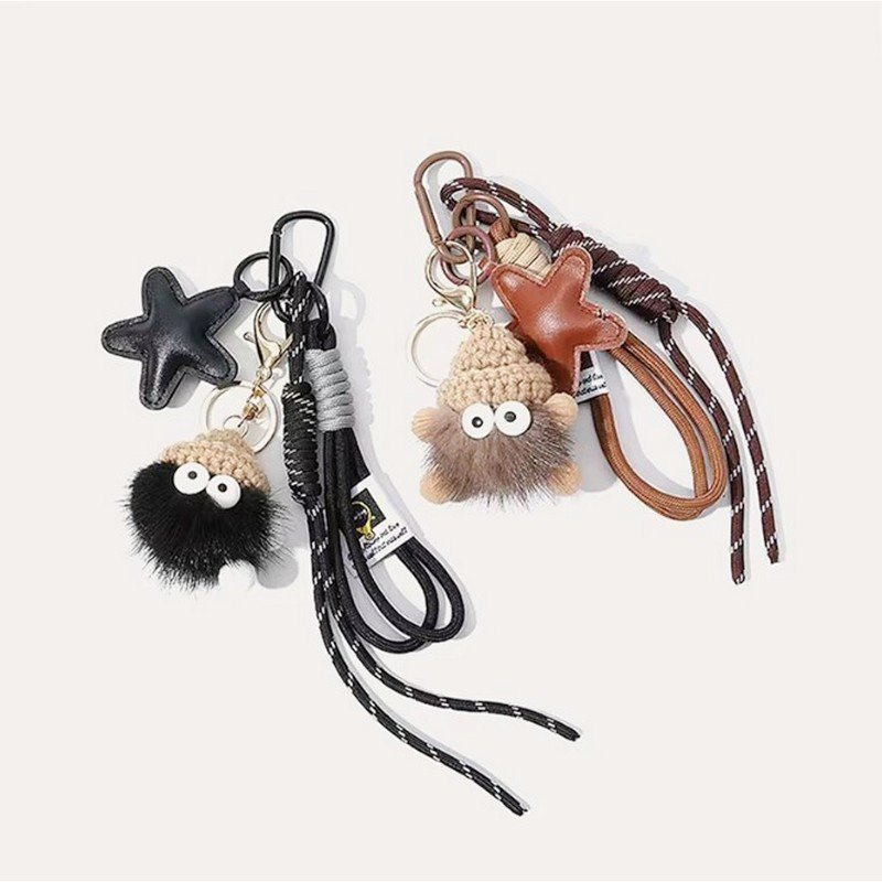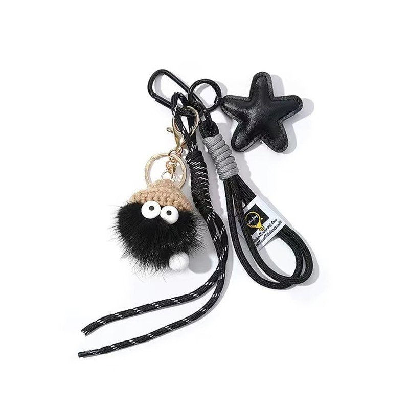 Krásná klíčenka/přívěsek na kabelku s příšerkou v černém provedení je vyrobena z kůže textilu a kovu.