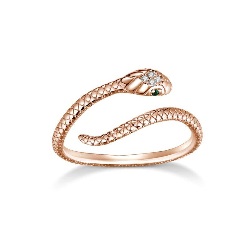 Nastavitelný stříbrný prsten zlacený růžovým zlatem ve tvaru hada omotávajícího se kolem vašeho prstu s očima z kubických zirkonů smaragdové barvy.